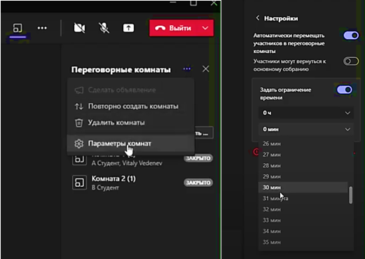 Обновился функционал для «переговорных комнат» или «breakout rooms». Теперь можно установить таймер для каждой открытой «комнаты». Но задать таймер в разделе «параметры комнаты» нужно до того, как вы откроете «комнату».
