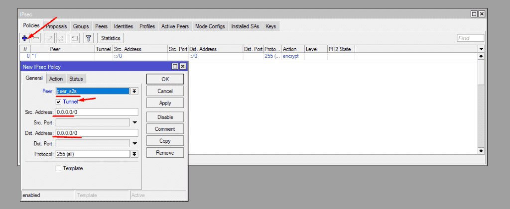 Переходим к роутеру Mikrotik, заходим в интерфейс и идем во вкладку IP – Ipsec – Policies, нажимаем «крестик» и добавляем новую политику. На вкладке General выбираем нужный нам peer, через который у вас идет VPN, ставим галочку на «Tunnel», вводим исходный адрес и удаленный адрес во вкладках Src и Dst, соответственно. Заходим во вкладку Action и ставим наши предложения, на которых работает VPN.