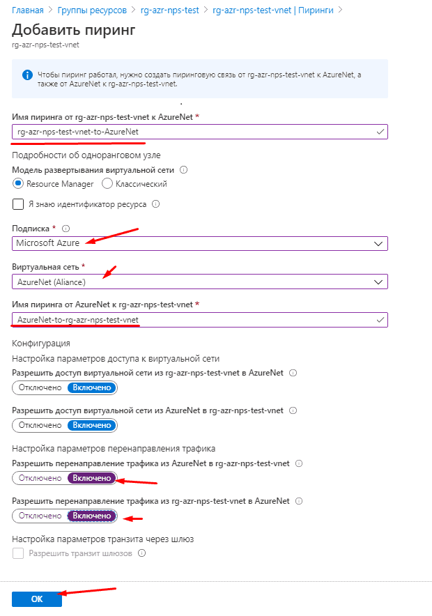 Для настройки пиринга сетей заходим в нашу группу ресурсов, после заходим созданную виртуальную сеть, ищем вкладку «Пиринги» и нажимаем на неё. Мы попали в окно создания пиринга, выбираем вашу подписку, в которой находится нужная вам группа ресурсов, после выбираем сеть, к которой у вас подвязан VPN. Вводим имя пиринга в ту и другую сторону, разрешаем ползунками перенаправление трафика в обе стороны и нажимаем «ОК», наш пиринг создан. Теперь осталось соединить наш пиринг с землей.