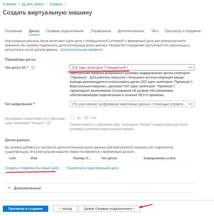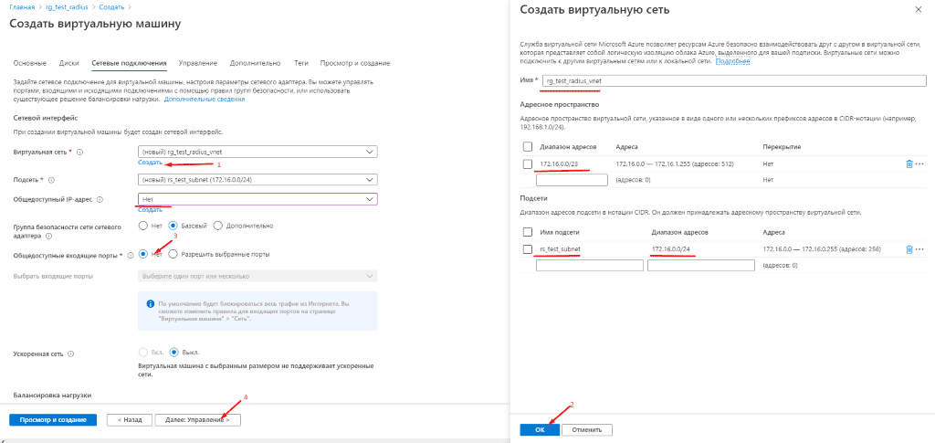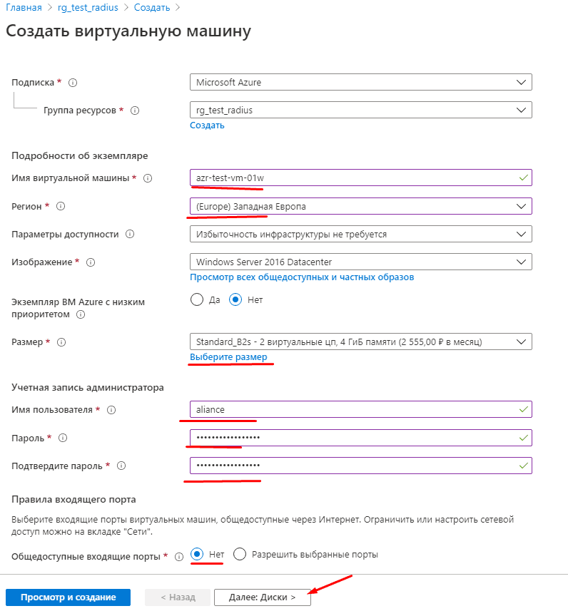 Наша группа ресурсов готова, можем приступать к разворачиванию виртуальной машины. Заходим в группу ресурсов и нажимаем «Добавить». Выбираем нужную редакцию ОС, после вводим настройки ВМ, а именно местоположение, название ВМ, её размер, имя пользователя и пароль, закрываем доступ к портам и нажимаем «Далее». Выбираем категорию дисков и добавляем новые, если потребуется, нажимаем «Далее». Создаем новую виртуальную сеть, можете делать любую адресацию, главное, чтобы адресное пространство и подсеть не пересекались, т.е. адресное пространство по /23 маске, а подсеть по /24 маске, убираем общедоступный IP и закрываем порты, нажимаем «Просмотр и создание».