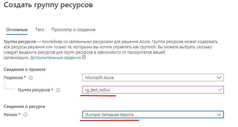 Для начала заходим в Azure, переходим в вашу подписку и создаём группу ресурсов. Пишем понятное вам название (лучше разделять ваши приложения и сервера на разные группы ресурсов, в зависимости от назначения этих ресурсов. Выбираем удобный вам регион (лучший для России – это Западная Европа).